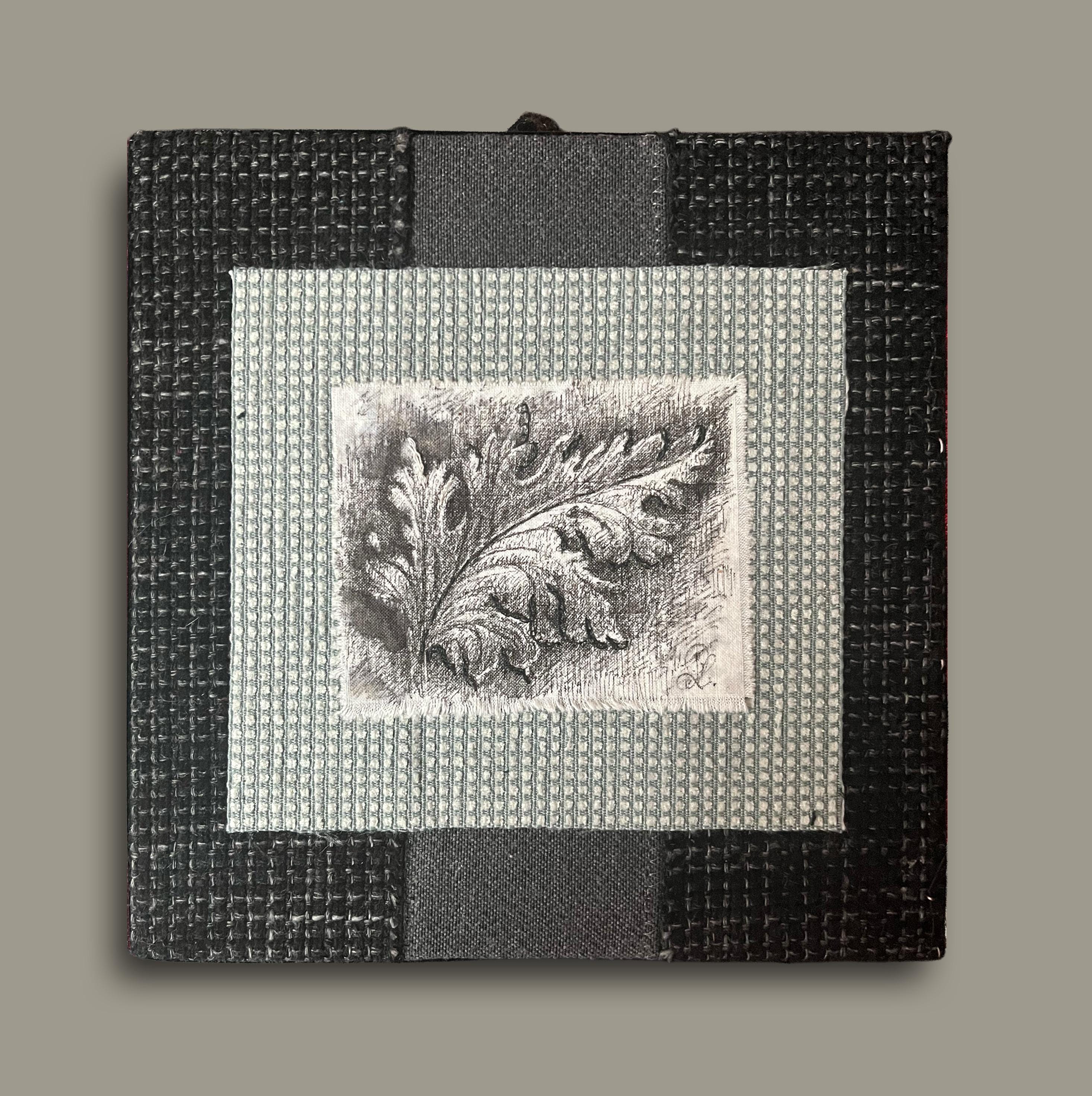 A painting with an organic cotton fabric application supporting a small acanthus leaf design created with a nib and ink. This piece pairs beautifully with similar pieces in both color and shape.