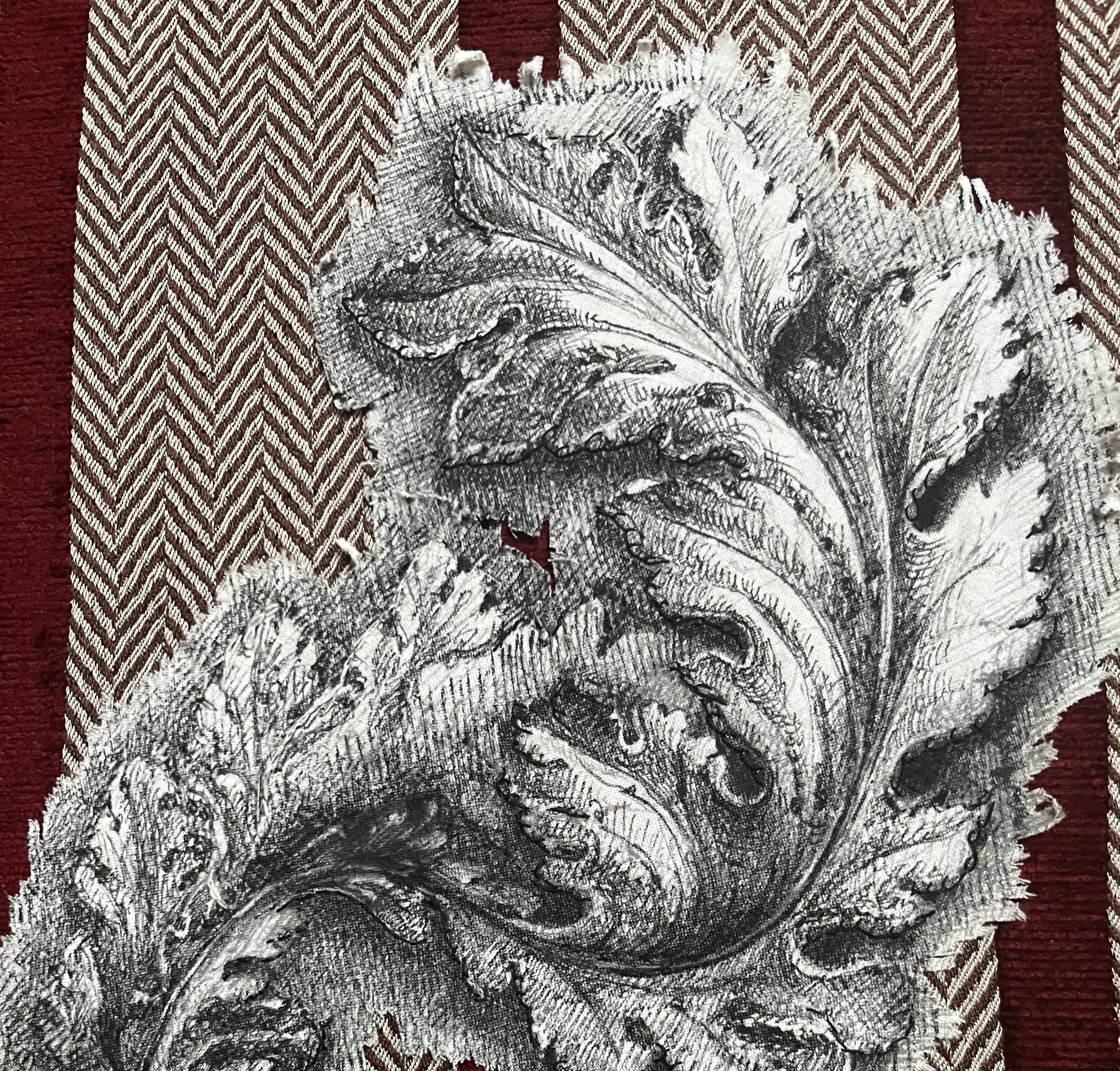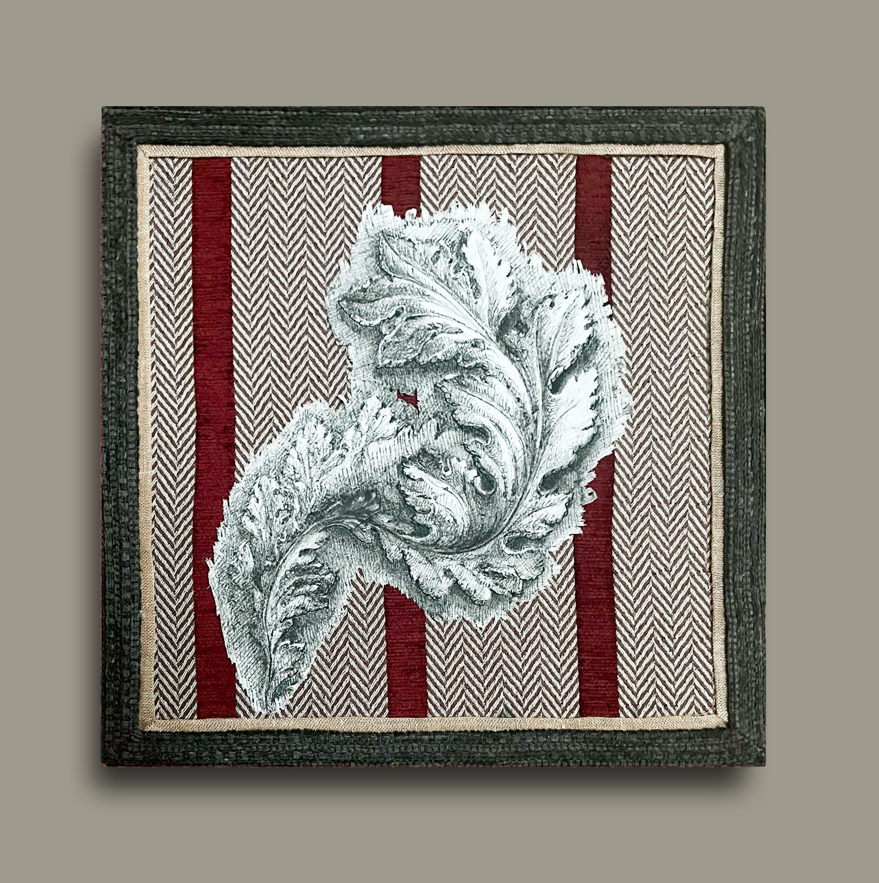 Acanthus leaf design made on fabric applied to an MDF panel covered with fine furnishing fabric. The first born!