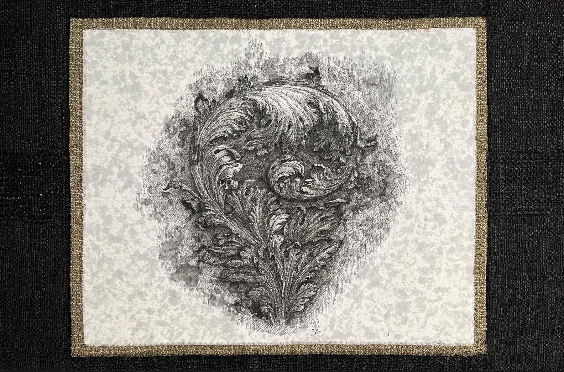 Acanthus leaf drawing created with a nib and ink on antique cotton fabric. The panel to which it is applied is finished with gray trimmings. An elegant, one-of-a-kind piece.